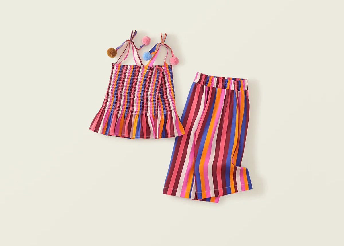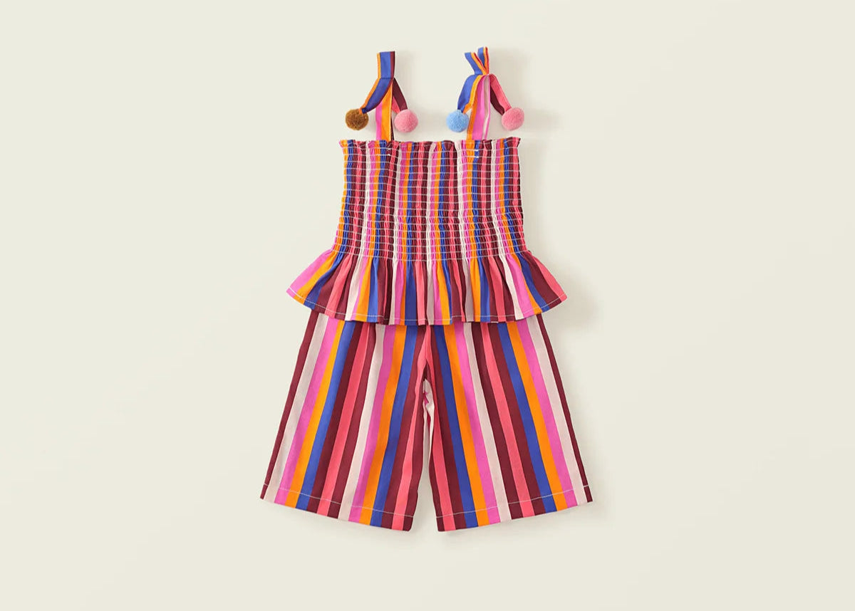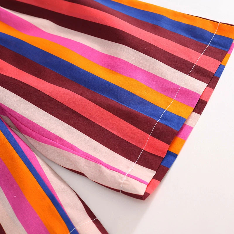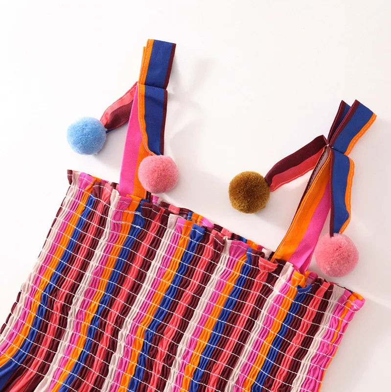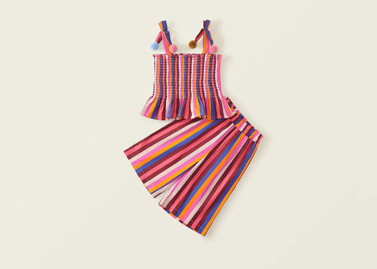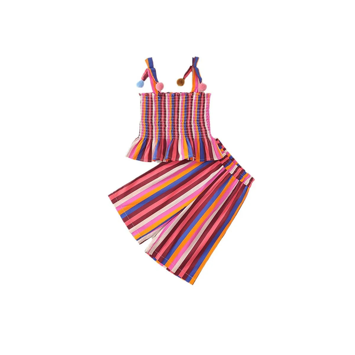 Dress your little ones in the trendiest and most playful look with our 2024 Summer New Fashion Striped Two-Piece Set! It features a sleeveless top and wide-leg pants that will surely make them stand out. Plus, the tie up pom poms and rainbow stripes add a fun and unique touch!