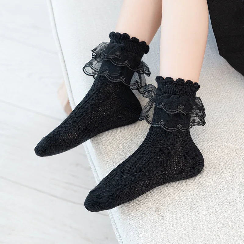 Enhance your little one's dance outfit with our 5 Pairs Girls Lace Ruffle Socks. Made of breathable cotton, these socks are comfy and adorable with a princess-style design and frilly trim. Perfect for any dance routine, they'll keep your child's feet comfortable and cute.