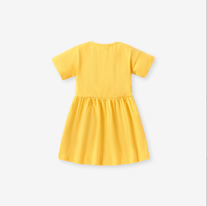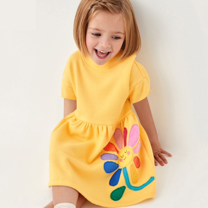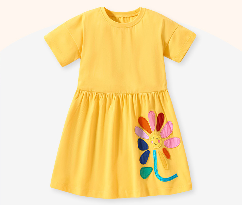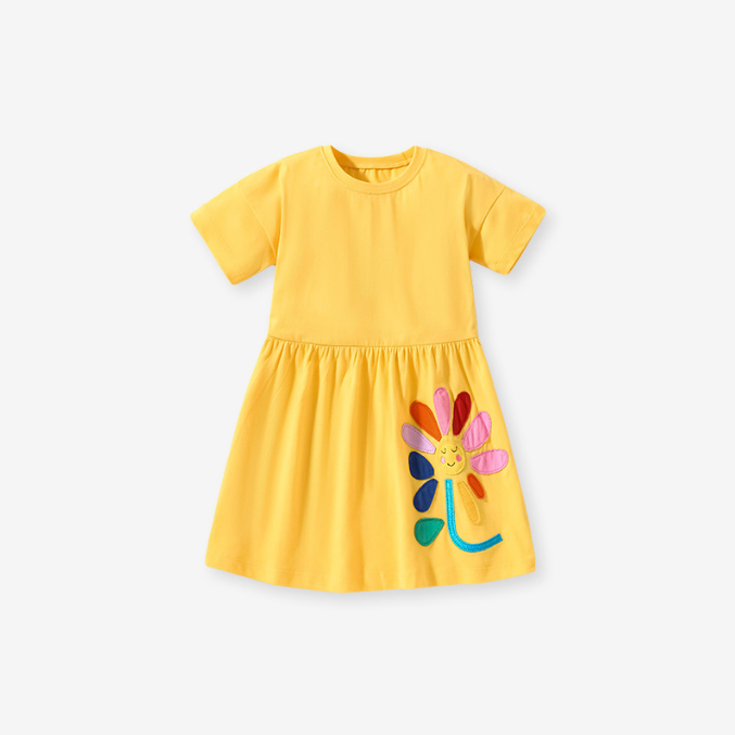 This adorable dress is the perfect addition to any little girl's wardrobe! With its soft and lightweight knit material, she'll stay cool and comfortable during warm summer days. The cute flower design adds a touch of sweetness to this playful piece. Perfect for school or special occasions.