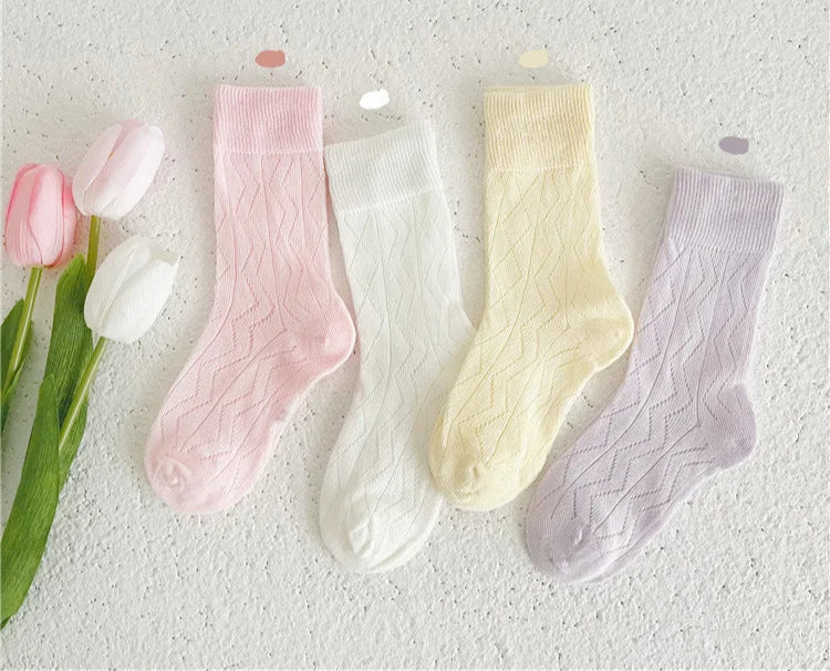 These high-quality children's summer socks are perfect for keeping little feet cool and comfortable during the warmer months. Made with soft and breathable cotton, these socks feature a solid design and a hollow pattern for added style. With 4 pairs in each lot, these socks are a summer must-have for kids.