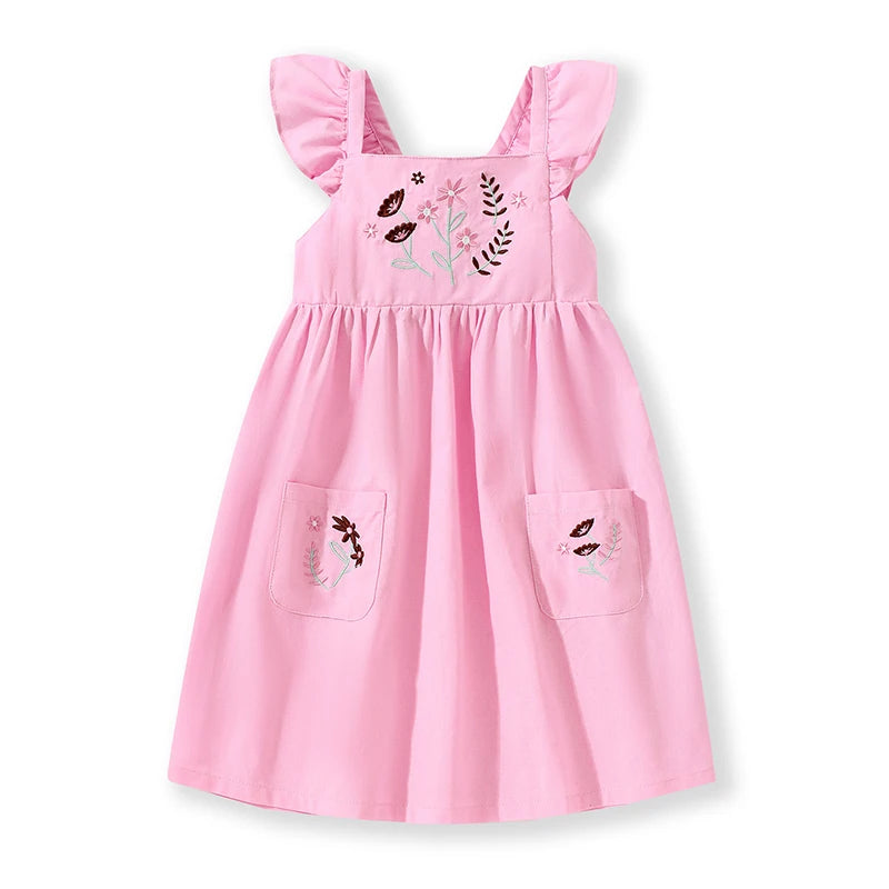Our Girls Summer Sleeveless Cotton Dress is made from soft, breathable cotton and features delicate flutter sleeves that add a touch of whimsy to any summer day in addition to delicate floral embroidery placed on two patch pockets. She'll stay cool and comfortable while looking effortlessly stylish.