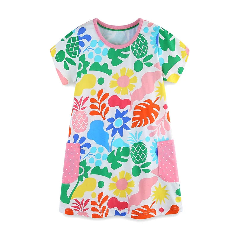 Get ready for some tropical fun in this girls' short sleeve summer dress! With bright colors and a playful print, this dress is perfect for a day at the beach or a picnic in the park. Made with lightweight fabric, it's also comfortable and breathable. Bring on the sunshine and smiles!