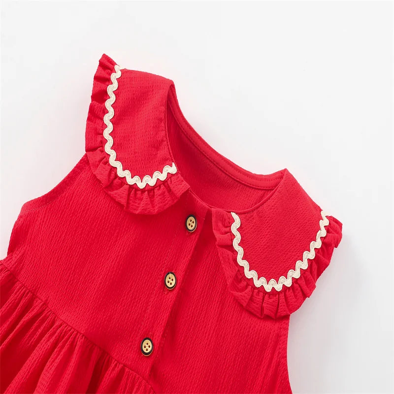 Get ready for playful adventures in our Girls Red Sleeveless Dress! This stylish and comfortable dress is perfect for any occasion. Featuring a vibrant red color and sleeveless design, your little one will feel confident and ready to take on the day. Don't miss out on this must-have addition to your child's wardrobe!