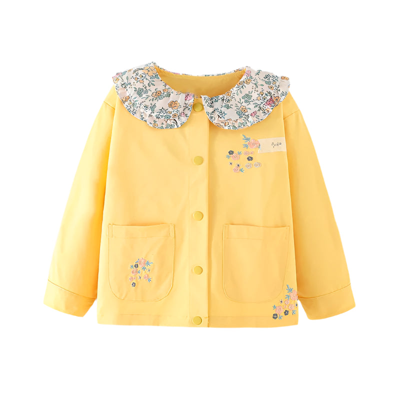 Add some flower power to your little one's wardrobe with our Girls Floral Embroidered Collar Jacket! With delicate floral embroidery on the collar, this jacket is both cute and stylish. Perfect for chilly days and adding a touch of whimsy to any outfit.