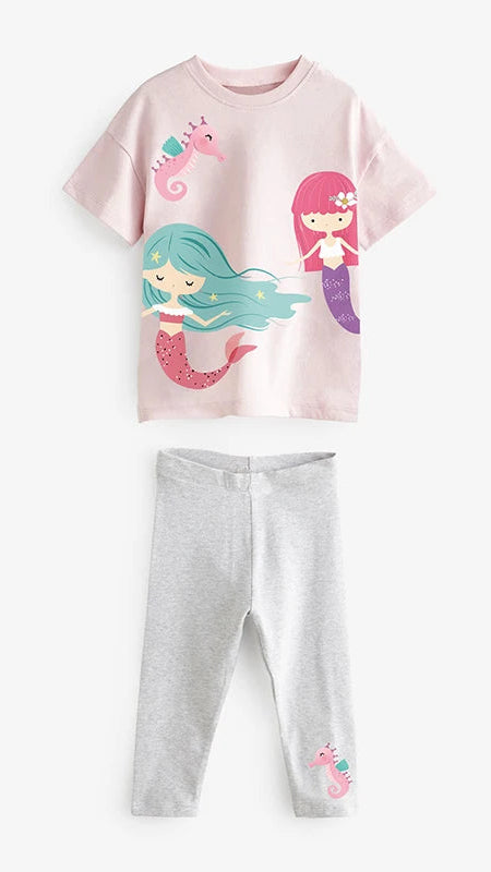 Get ready to make a splash with these Girls SS T Shirt Tops and Mermaid Leggings. Perfect for any young mermaid enthusiast, these comfortable and stylish pieces are a must-have for any summer wardrobe. With a playful spin on traditional tops and leggings, your little one will love this unique and fun outfit!