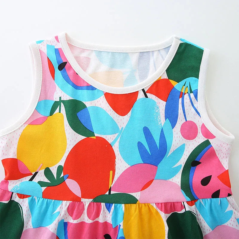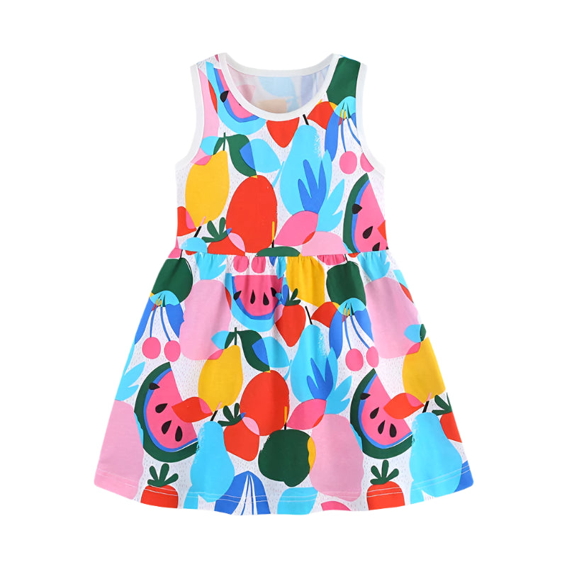 Get your little one ready for some fun in the sun with our Girls Allover Fruit print Sleeveless Dress! With a colorful and playful fruit print, this dress is perfect for any summer day. Made with lightweight and breathable material, your child will stay cool and comfortable while still looking stylish. Available in various sizes for the perfect fit. Let your child's personality shine with this quirky and adorable dress!