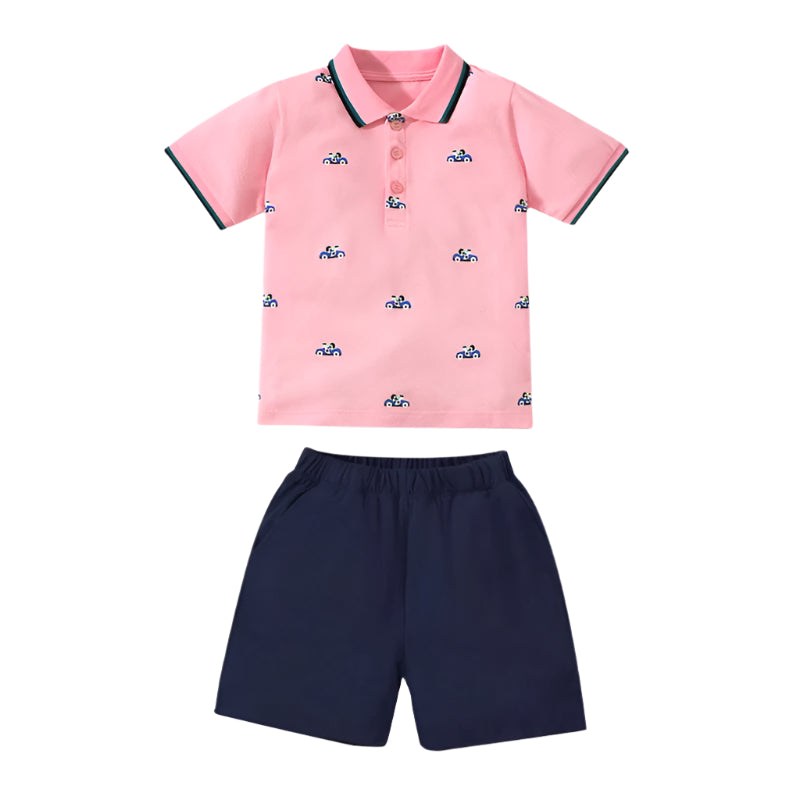Get ready for summer fun in this Polo & Shorts set! The allover car print adds a playful touch to the polo, while the navy shorts complete the look. Stay comfortable and stylish in this quirky set. (One exclamation point is enough, trust us.)